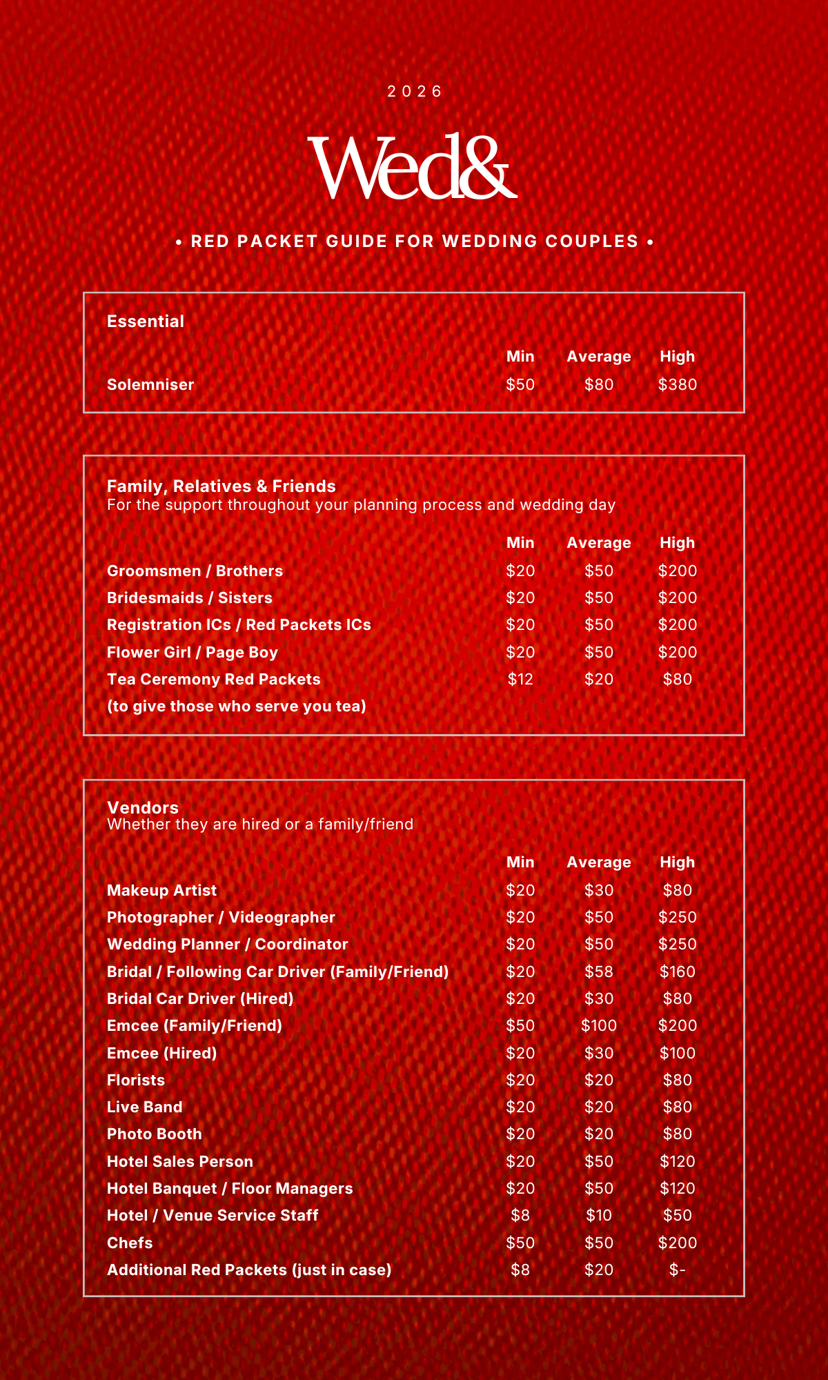 Red packets for vendors are a gesture of appreciation and blessing, they are not compulsory. Whether to give them depends on your overall wedding budget. If setting aside funds for vendor red packets would create financial strain, it is perfectly fine to skip them. Your vendors are already compensated for their services; the red packet is a personal expression of gratitude, not an obligation.